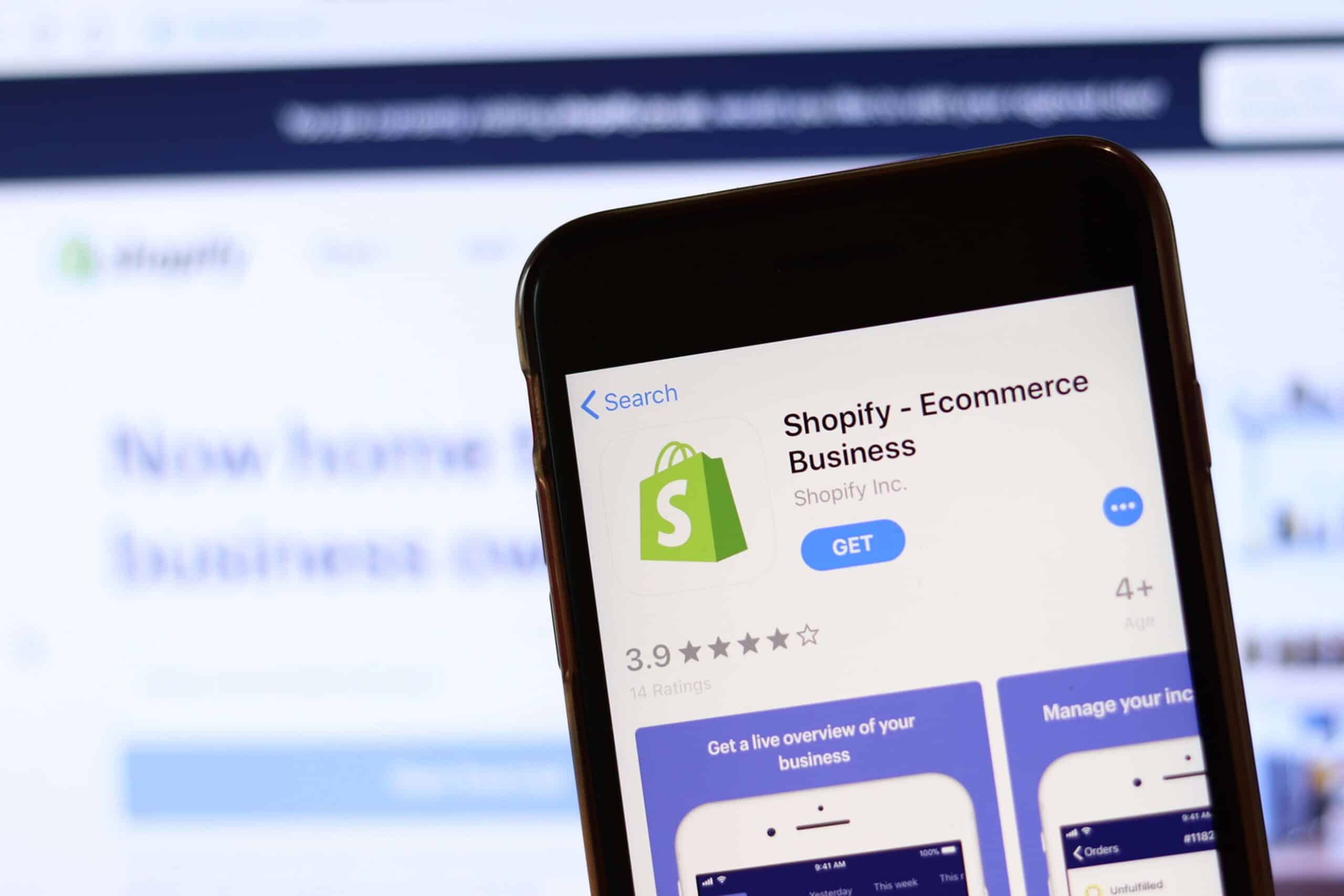 shopify-movil-aplicacion@3x Última actualización: febrero 16, 2022 1:54 PM Por Editor Compartir Teléfono con icono de Shopify en pantalla de cerca con sitio web borroso en portátil.