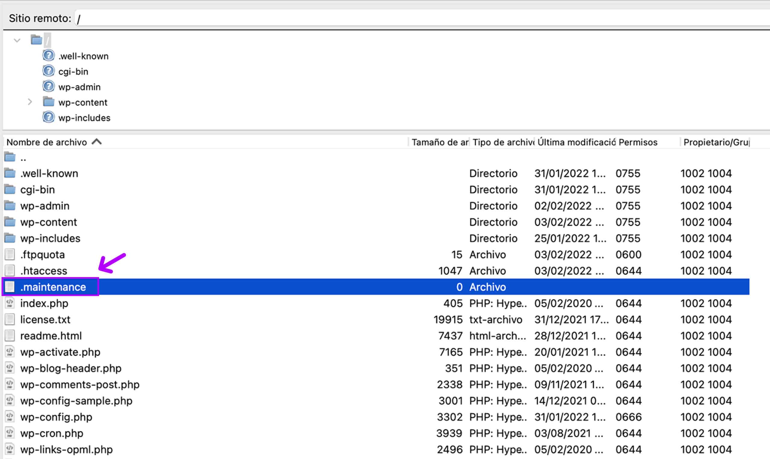 Ubicando el archivo temporal de mantenimiento .maintenance que provoca el mensaje de error error «brevemente no disponible para mantenimiento programado» en el directorio principal de WordPress.